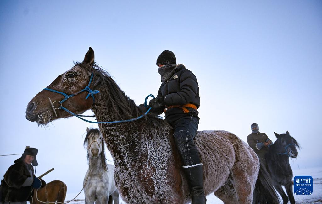 12月15日,乃日嘎(中)、伊吉力(右)和额尔敦达来在草原上一起驯马。