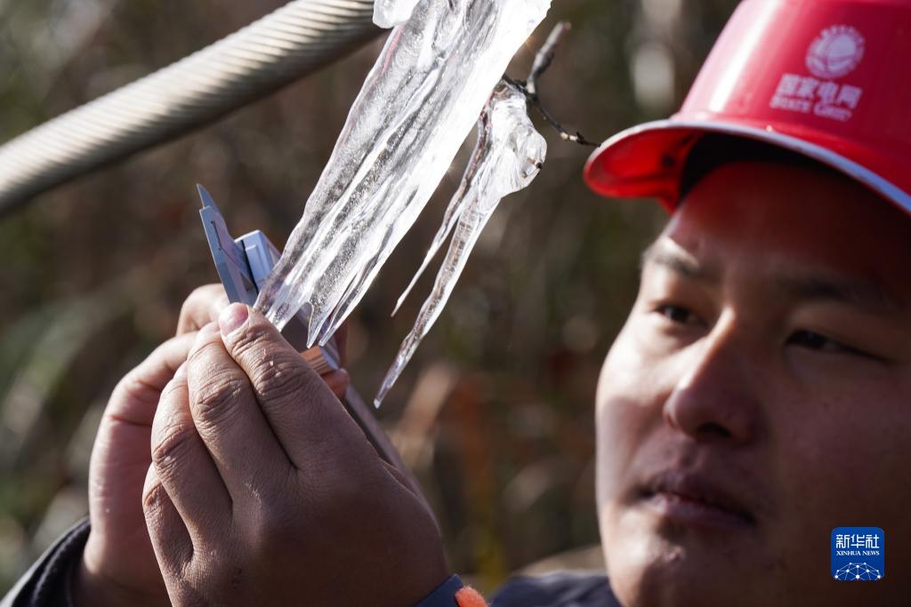 12月22日,安徽送变电工程有限公司员工张宁宁在500千伏文官5391线模拟导线上测量覆冰厚度。