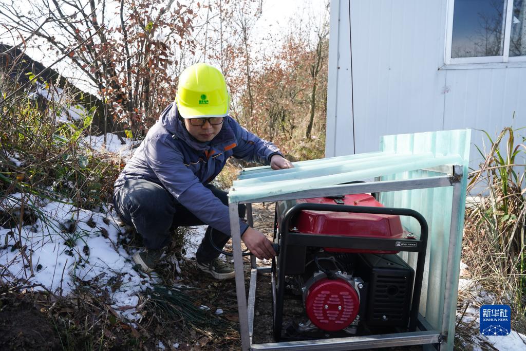 12月22日,安徽送变电工程有限公司员工吴森在500千伏文官5391线241覆冰观测站外启动发电机为站内供电。