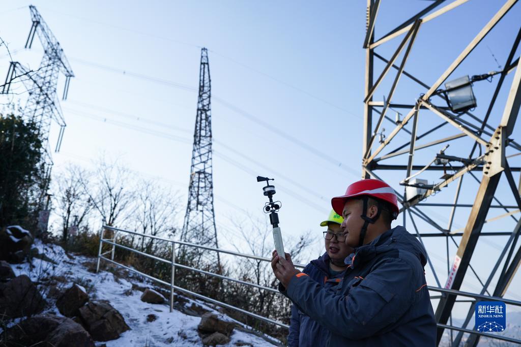 12月21日,安徽送变电工程有限公司员工张宁宁(右)、吴森在500千伏文官5391线上监测气象数据。
