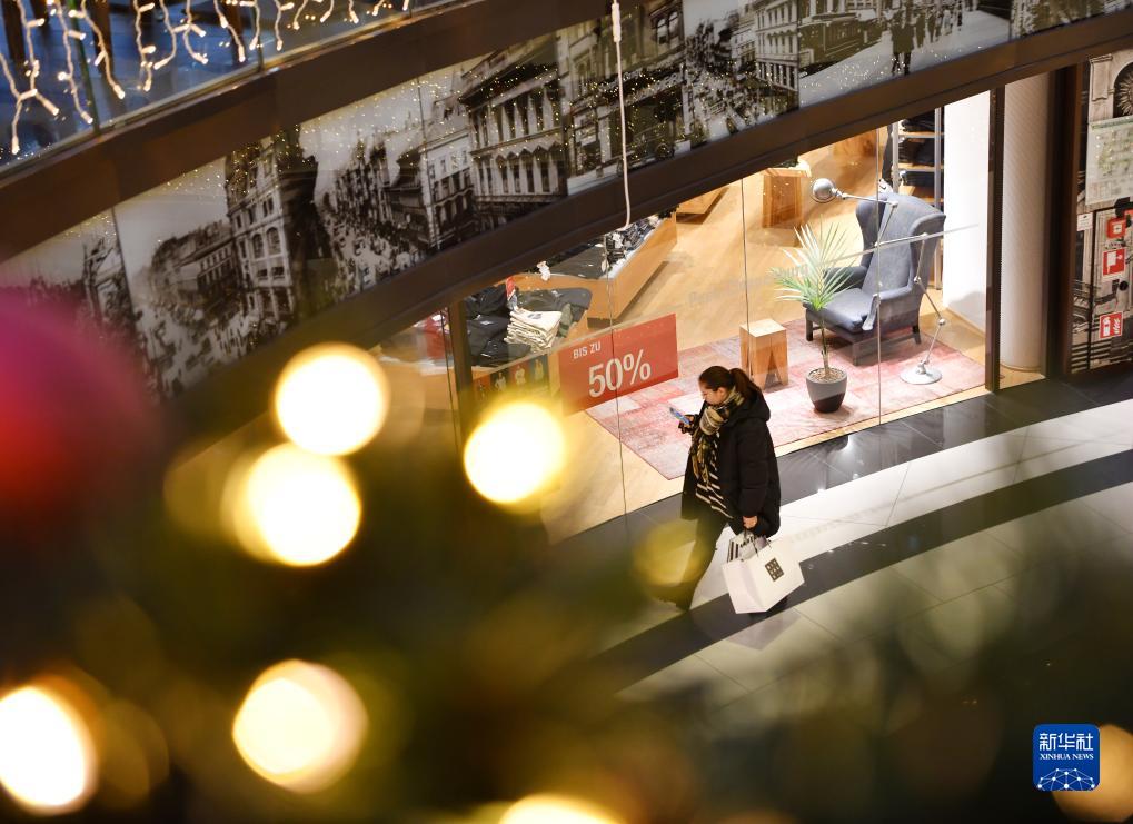 12月21日,一名女子经过德国柏林一家购物中心的打折店铺。