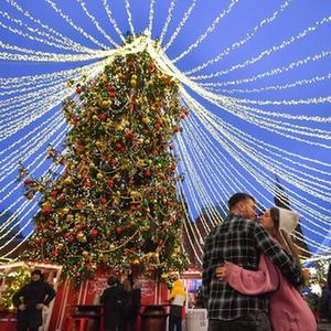 12月21日,在俄罗斯首都莫斯科,人们从新年装饰前走过。