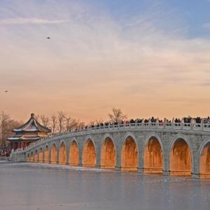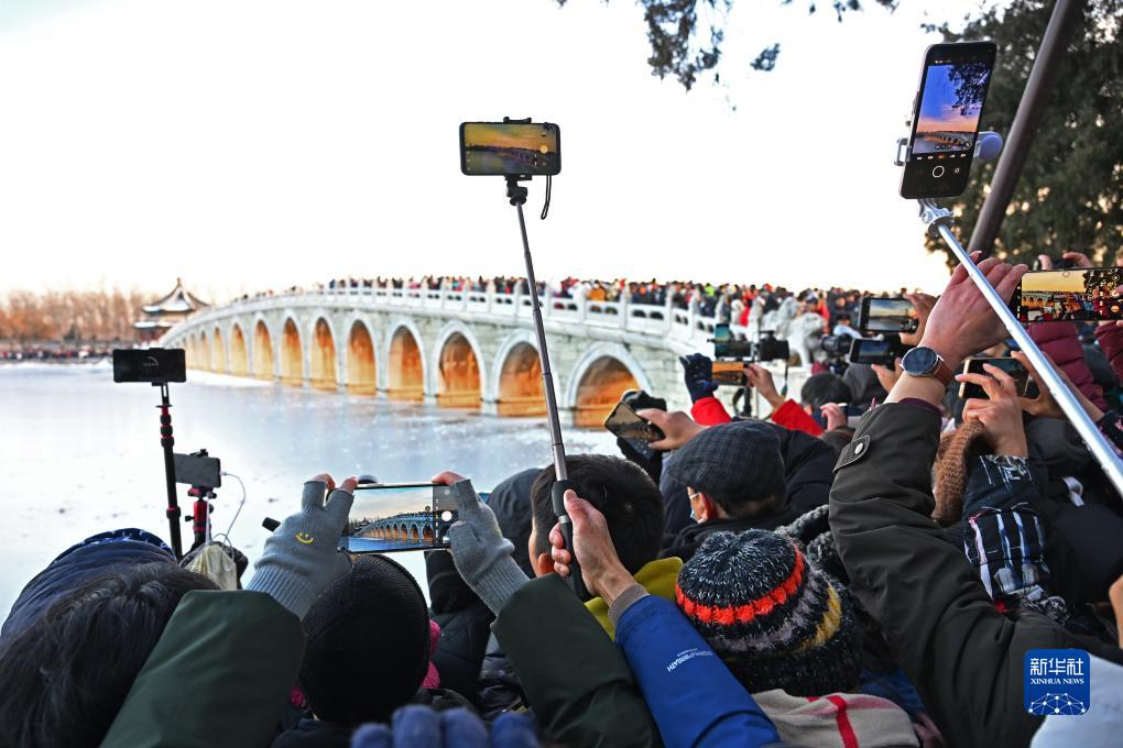 当日是冬至节气,颐和园十七孔桥的“金光穿洞”奇景吸引大批游客前来观赏拍摄。