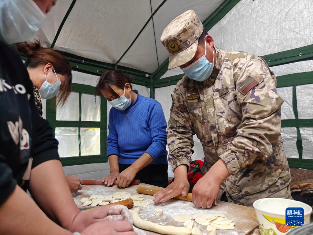 12月22日,武警青海总队官兵在青海省民和县中川乡临时安置点和受灾群众一起包饺子。