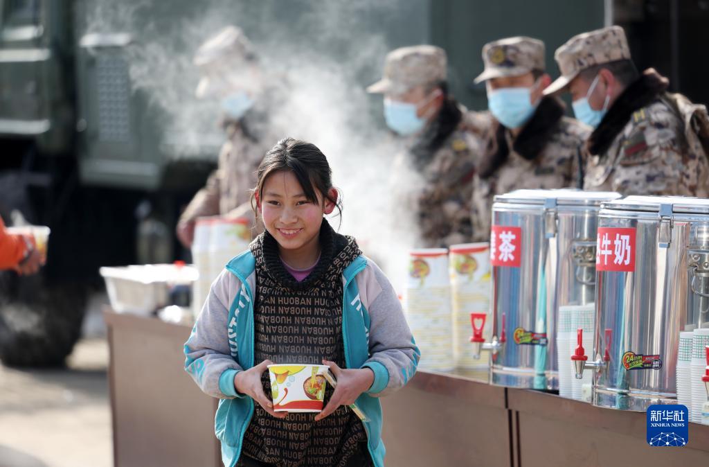 12月22日,在甘肃省积石山县刘集乡肖家村文化广场,武警甘肃总队机动支队官兵为受灾群众提供水饺。