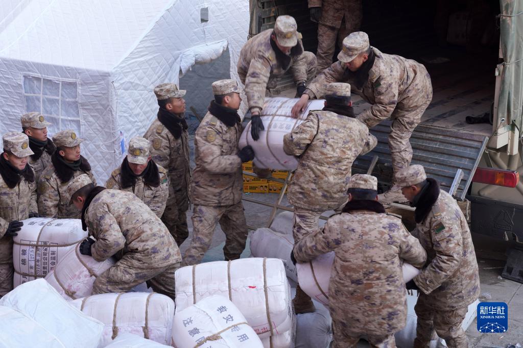 12月22日,陆军第76集团军某旅官兵为受灾的甘肃省积石山县石塬镇8个自然村运送物资。
