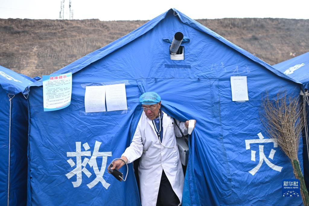 12月22日,完么仁增在牙木村安置点测量完群众血压后走出帐篷。