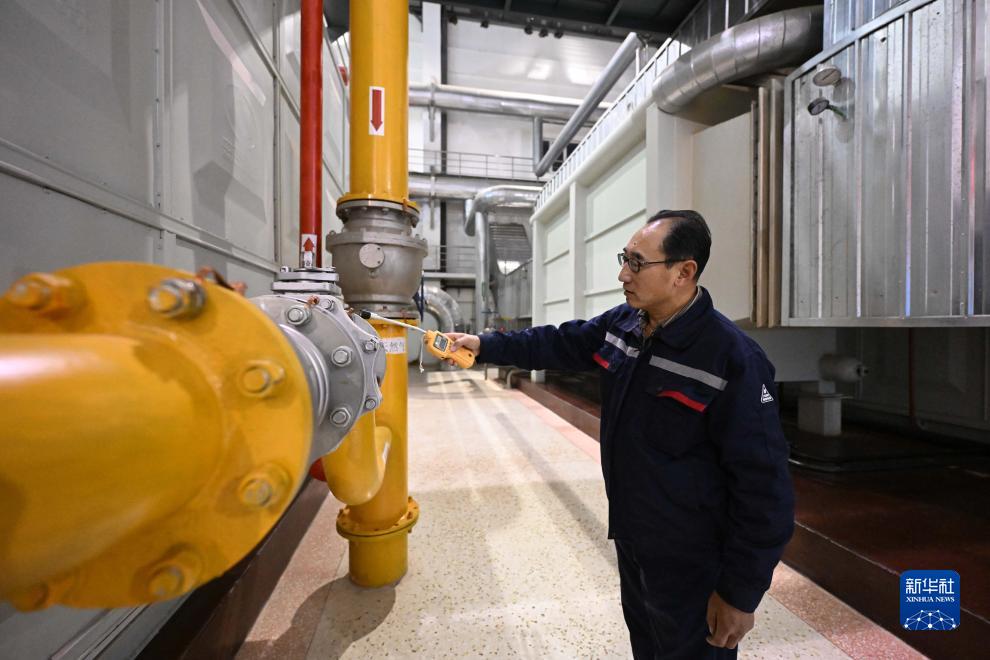 12月22日,在天津市泰嘉热力管理有限公司胜利路供热站,值班人员在夜间值守时使用专业仪器设备对运行中的设备进行巡检。