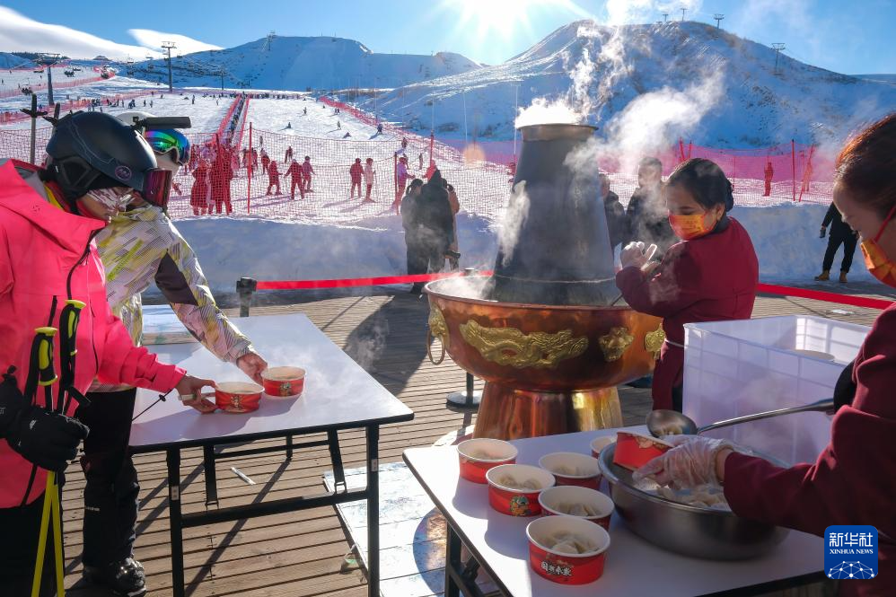 12月22日,游客在新疆阜康市天山天池国际滑雪场领取景区免费提供的冬至饺子。