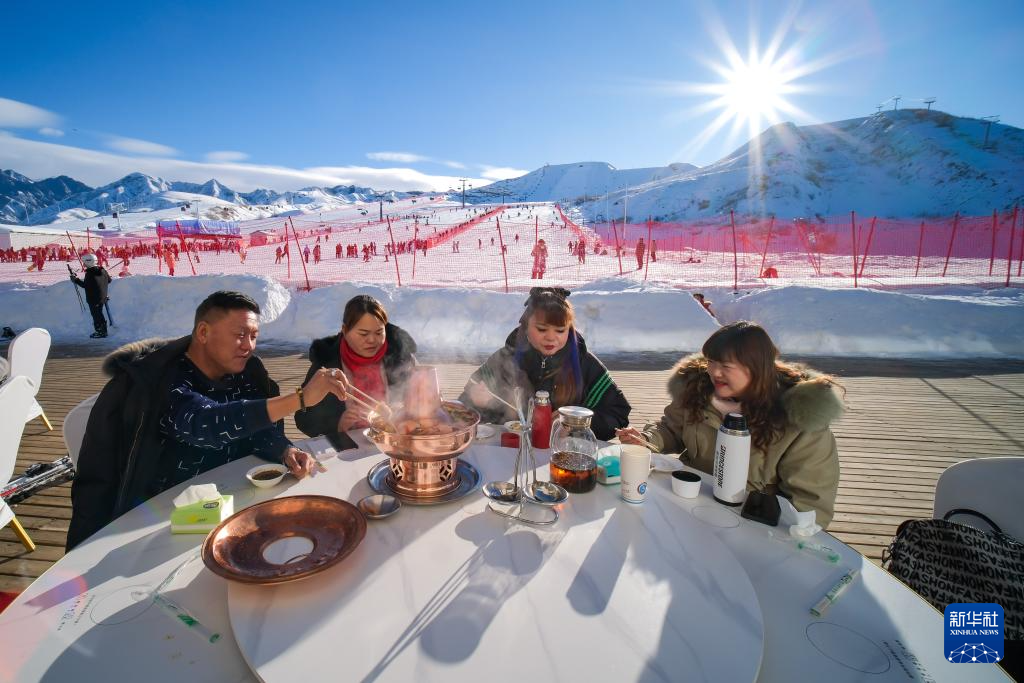 12月22日,游客在新疆阜康市天山天池国际滑雪场吃火锅。