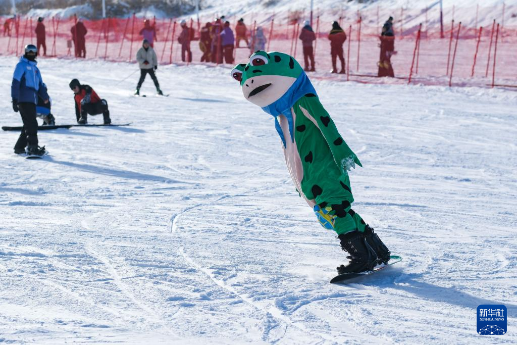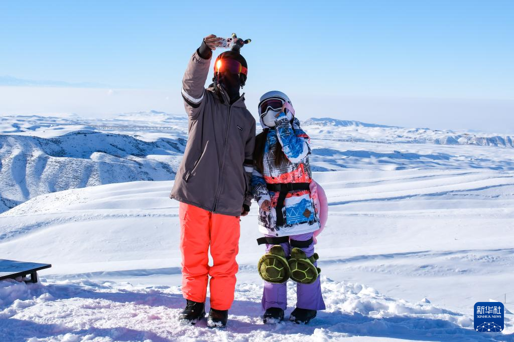 12月22日,游客在新疆阜康市天山天池国际滑雪场摆造型拍照。