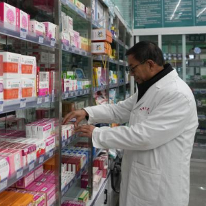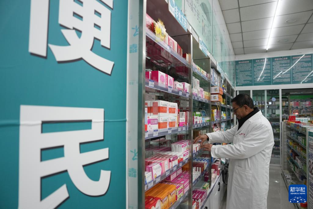 12月23日,在甘肃省临夏州积石山县县城,药店工作人员在整理货架上的药品。