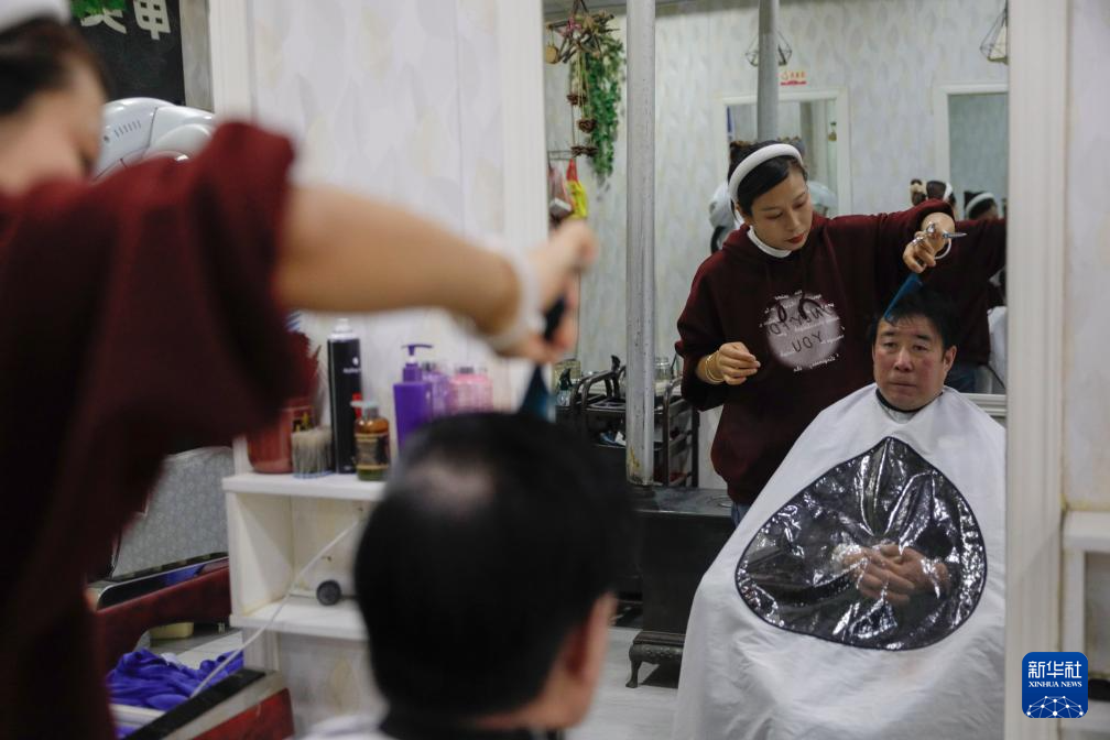 12月23日,在甘肃省临夏州积石山县县城,理发店店主在帮顾客剪头发。