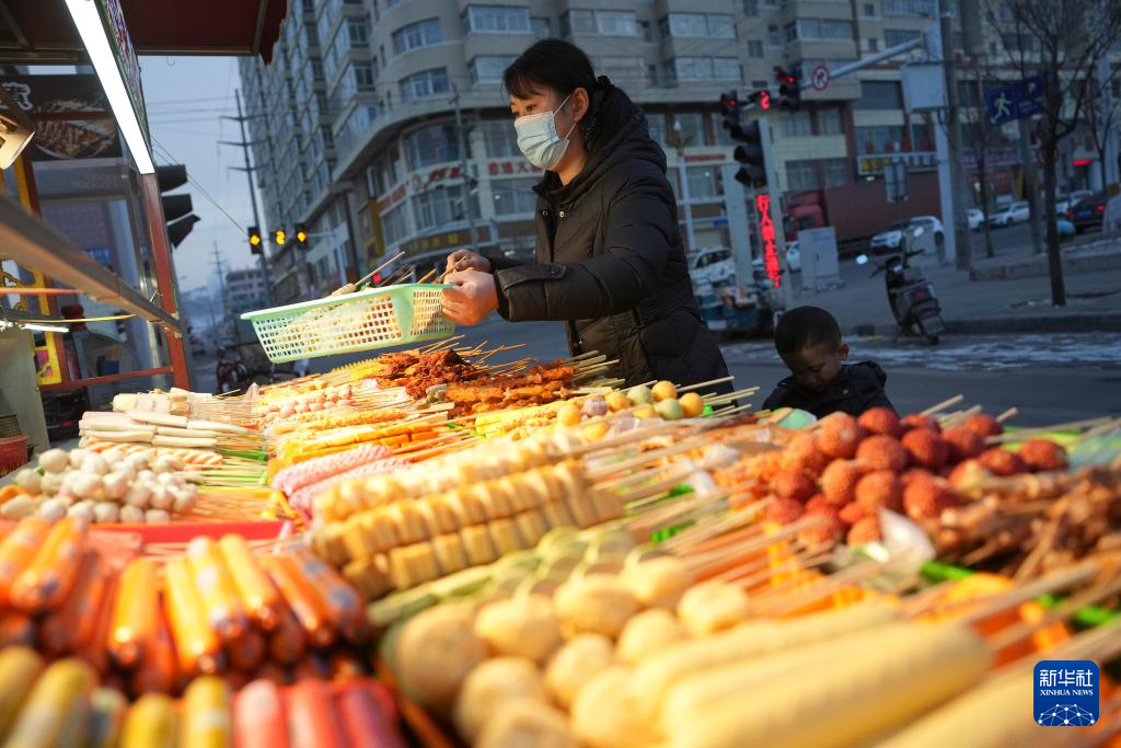 12月23日,在甘肃省临夏州积石山县县城,顾客在夜市上选购小吃。