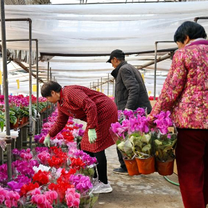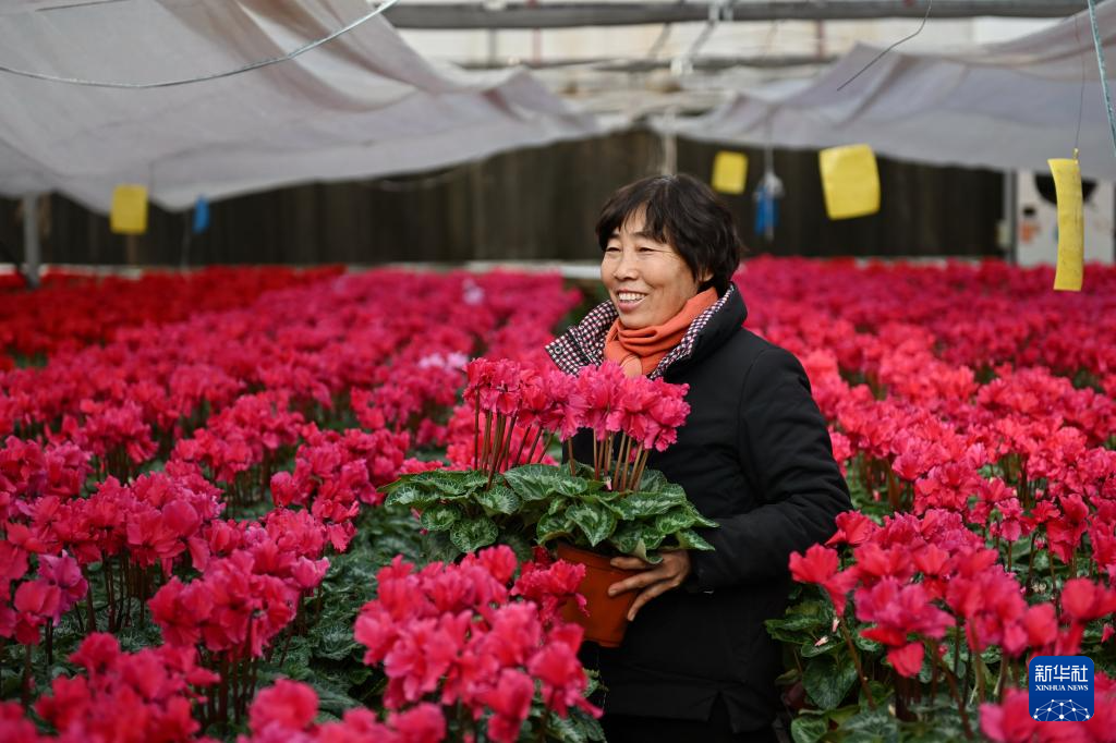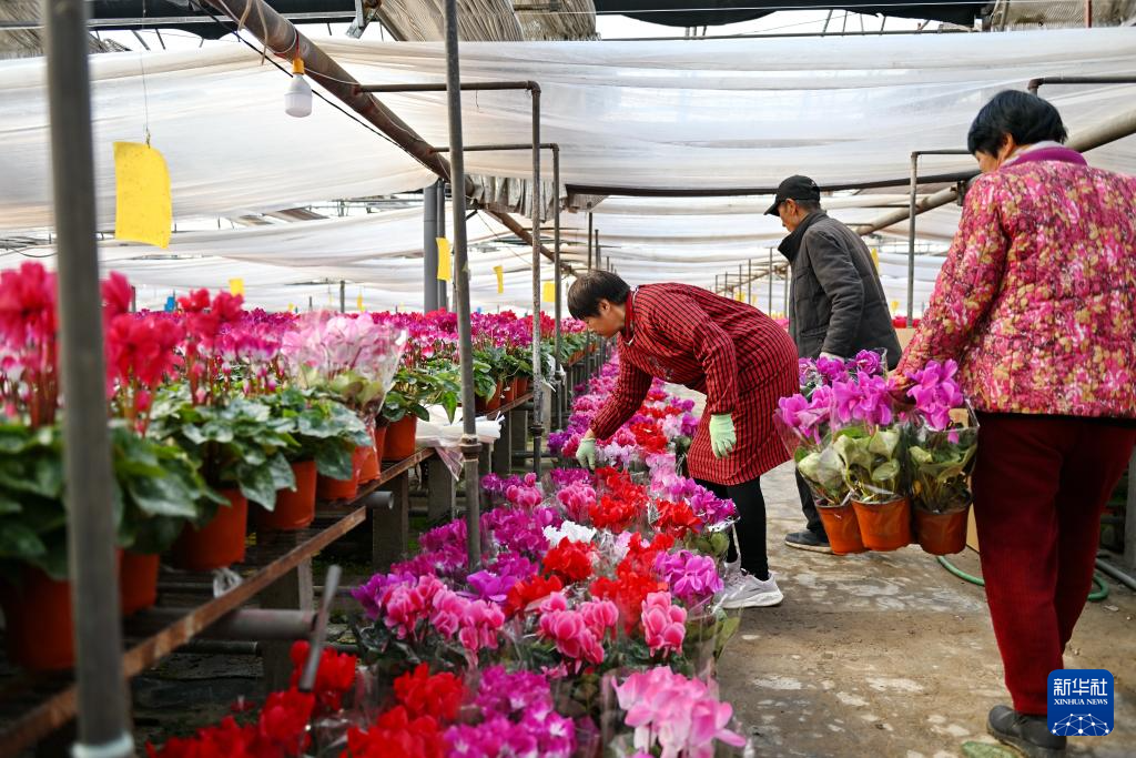 12月23日,花农在石家庄市栾城区农林高科技园区花卉种植大棚内整理仙客来,准备装箱外运。
