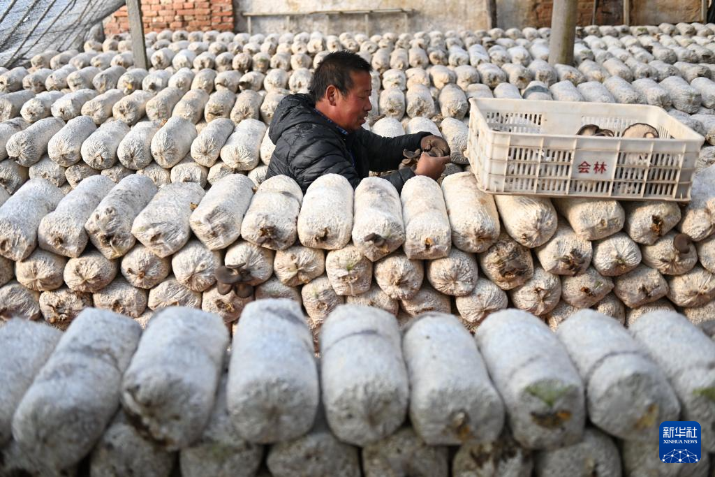 12月23日,农民在石家庄市栾城区前彪冢村平菇种植基地内采收平菇。
