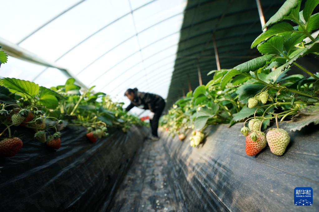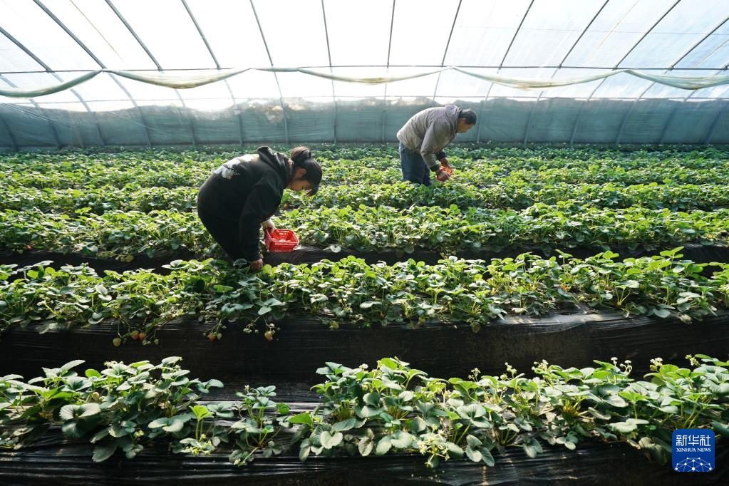 12月23日,农民在石家庄市栾城区苏园小镇温室大棚内采摘富硒草莓。