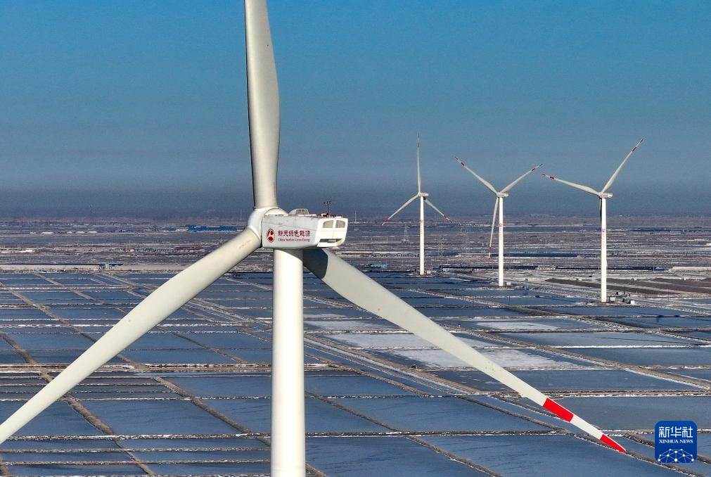 12月22日拍摄的河北省唐山市海港经济开发区大清河盐田内的风电场(无人机照片)。