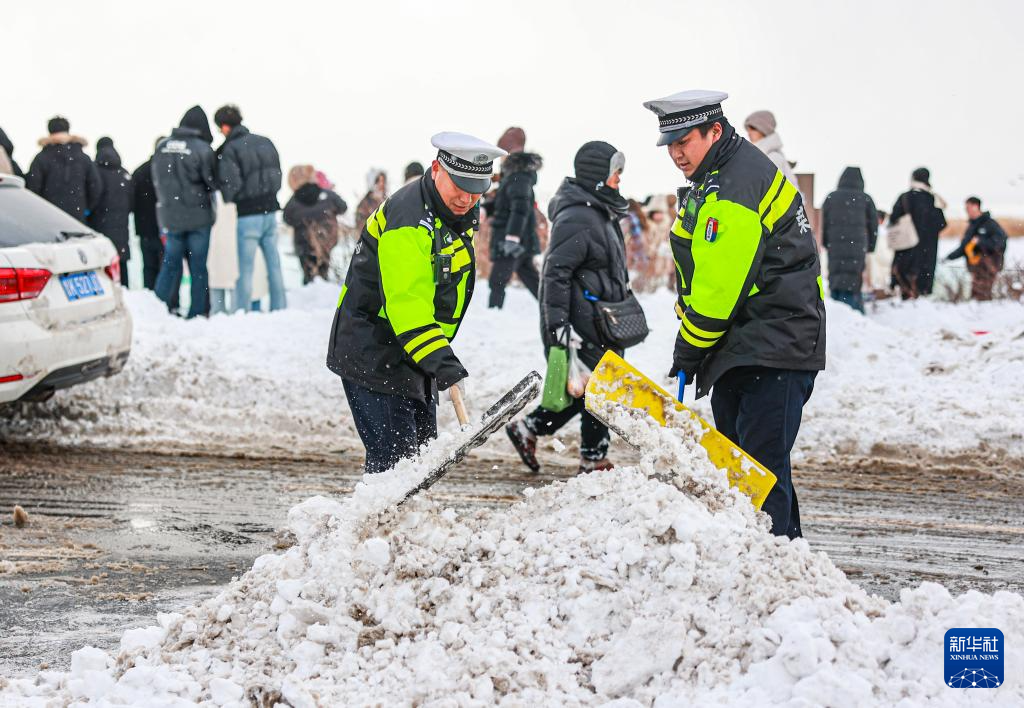 12月22日,在山东省荣成市成山镇天鹅湖景区,执勤民警利用换班间歇,在清扫路面积雪。