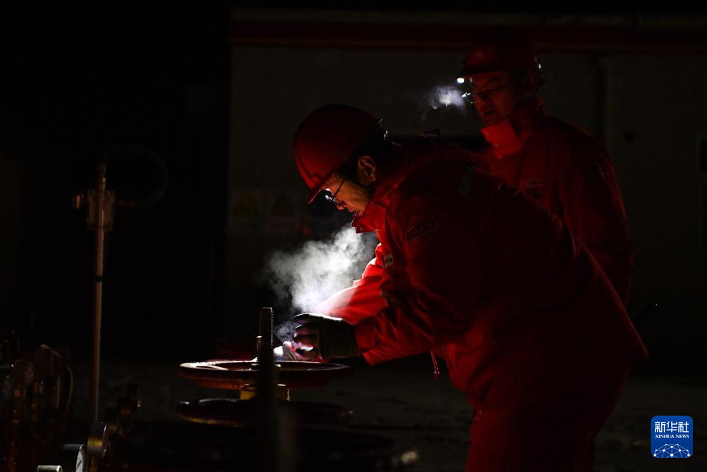 12月22日晚,在陕西省延安市安塞区,中国石油长庆油田分公司第一采气厂作业七区工作人员在巡检天然气输气设备。