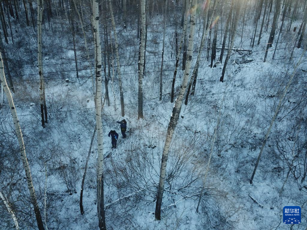 12月23日,在黑龙江省漠河市,电力线路设备运维人员在北极村附近的山林中巡线(无人机照片)。