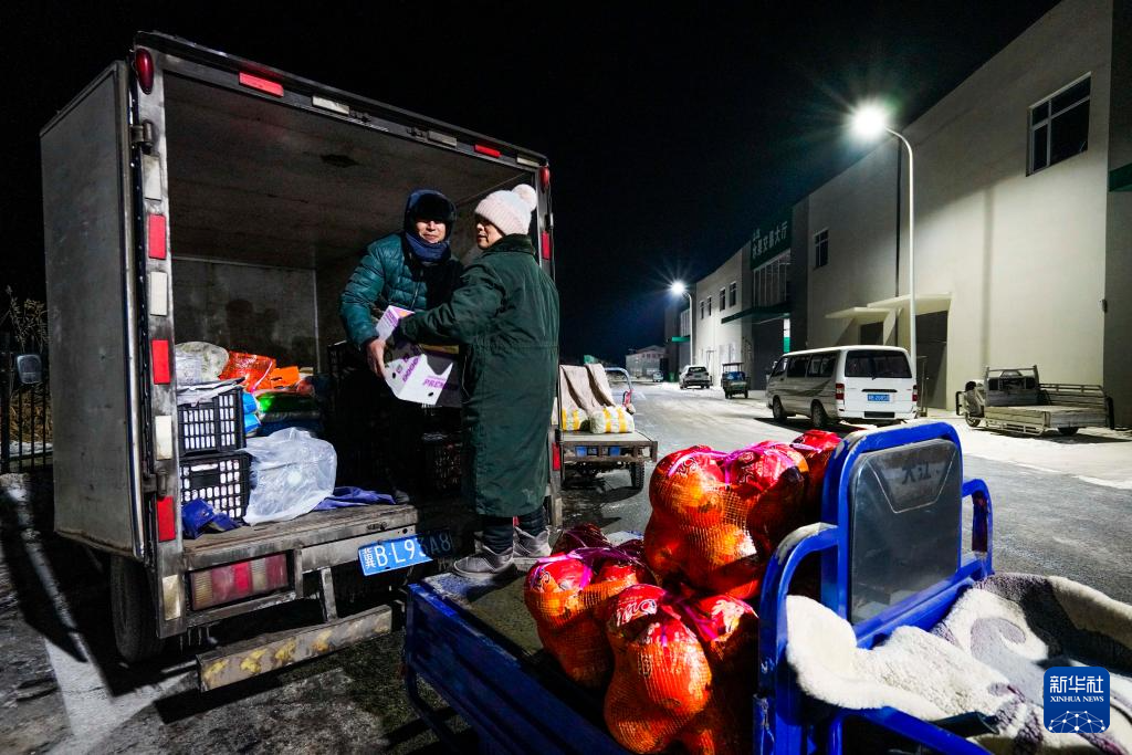 12月23日凌晨,在河北省遵化市农贸市场,经销商将批发的水果装车以供应市场。