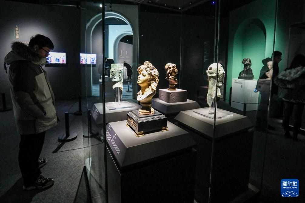 12月22日,参观者在“青铜之光”特展上观看《大战巨蟒的阿波罗》。
