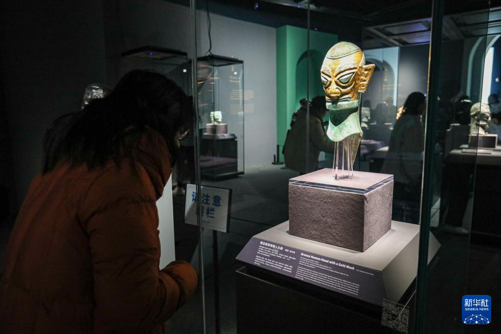 12月22日,参观者在“青铜之光”特展上欣赏戴金面罩青铜人头像。
