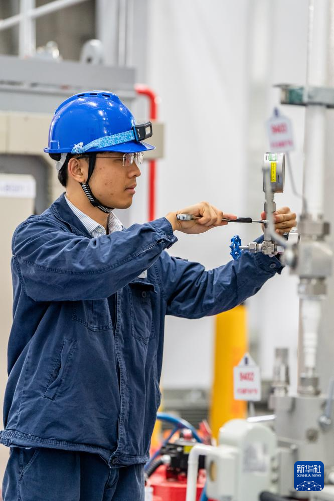 工作人员在右岸地下厂房对水轮发电机组调速器压力油罐压力表进行检查更换(12月22日摄)。