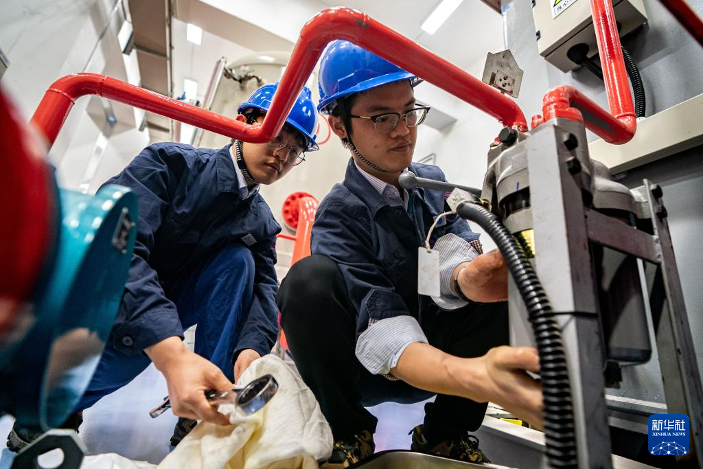 工作人员在右岸地下厂房对水轮发电机组调速器压力油泵出口过滤器滤芯进行检查(12月22日摄)。