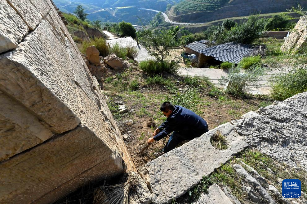 在偏关县滑石涧堡,吕成贵用手机记录下古堡大门如今的模样。虽然历经数百年风雨,拱门匾额上的“镇宁”二字依旧清晰可见(8月29日摄)。