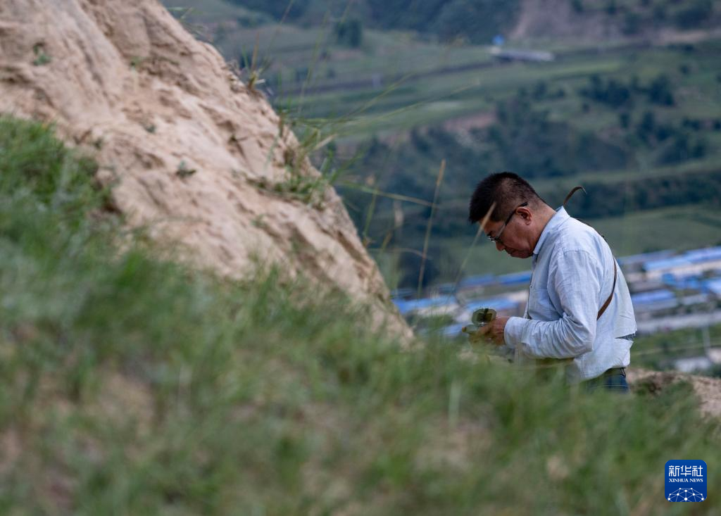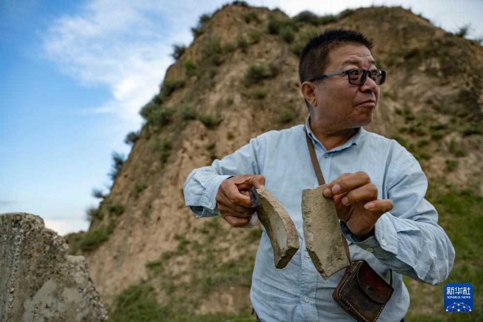 在偏关县老营堡附近的一座墩台前,吕成贵敲击散落在地上的瓦片,通过声音推断瓦片的材质和年代(8月28日摄)。