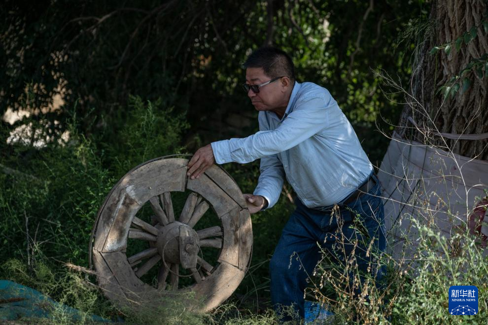 吕成贵在老牛湾村搬运古代战车车轮模型。他计划制作一系列仿古兵器,向游客展示古代长城的军事防御功能(8月28日摄)。