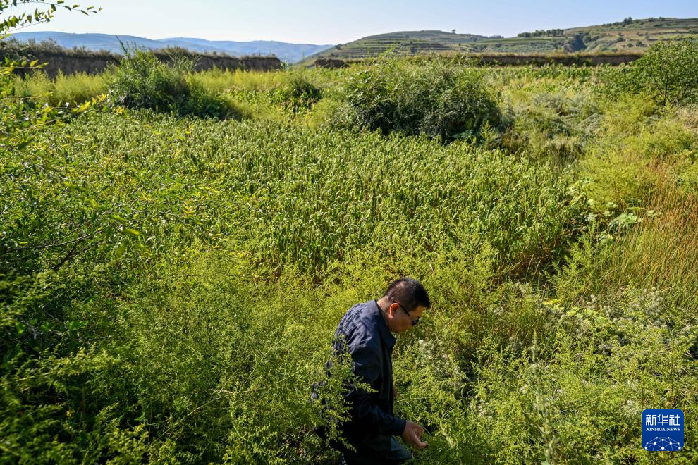 在偏关县滑石涧堡,吕成贵在草丛中寻访古堡当年的历史遗存(8月29日摄)。