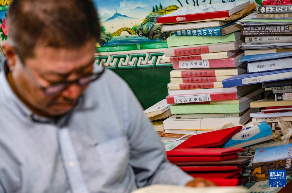 吕成贵家的炕头上堆满了与长城历史文化相关的资料(8月28日摄)。