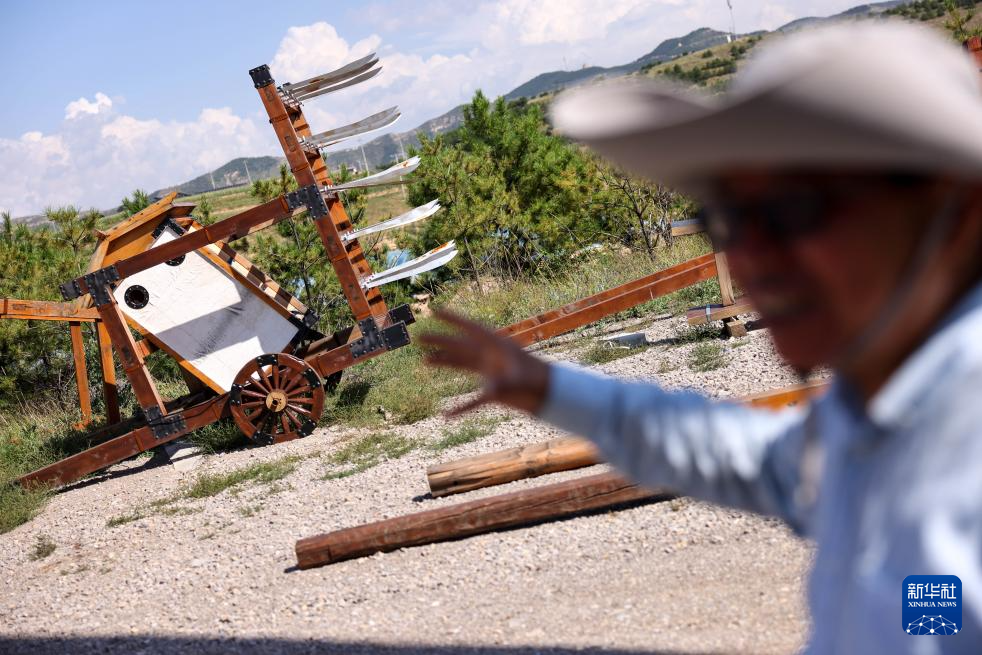 在偏关县老牛湾村,吕成贵介绍自己仿制的明代长城守军兵器。这段时间,老吕一直忙于查阅文献典籍,试图“重现”长城守军当年使用的兵器(8月28日摄)。