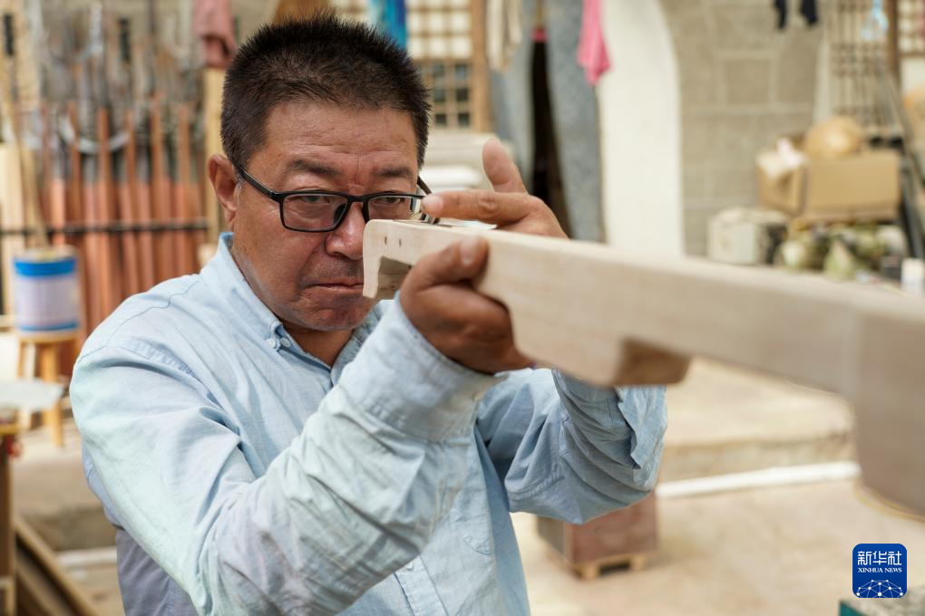 在偏关县老牛湾村,吕成贵在调试其制作的长城文创产品(8月28日摄)。