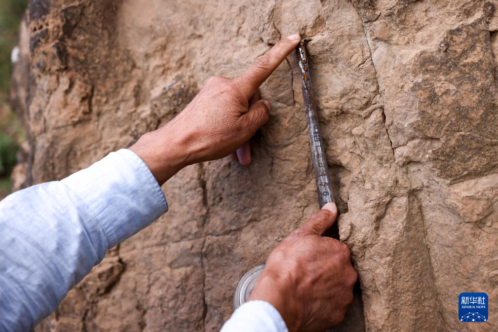 考察长城途中,吕成贵的衬衣背部被意外损坏(8月28日摄)。