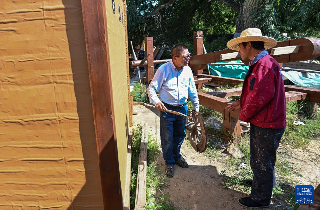 吕成贵在老牛湾村与制作仿古长城兵器的工人交流(8月28日摄)。