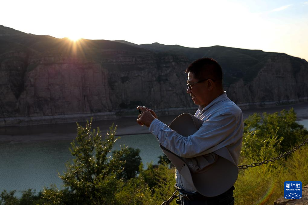 吕成贵用手机记录偏关县老牛湾村日落风景(8月27日摄)。