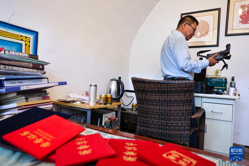 吕成贵在偏关县老牛湾村的窑洞中准备无人机。现代化的影像采集手段大大方便了吕成贵的长城调研工作(8月28日摄)。