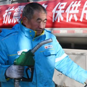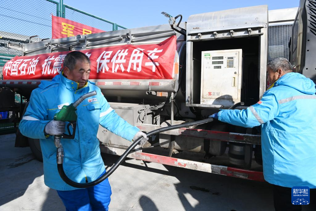 12月24日,在积石山县刘集乡高李村安置点,中国石油甘肃销售公司的员工准备用流动加油车为救灾车辆加油。