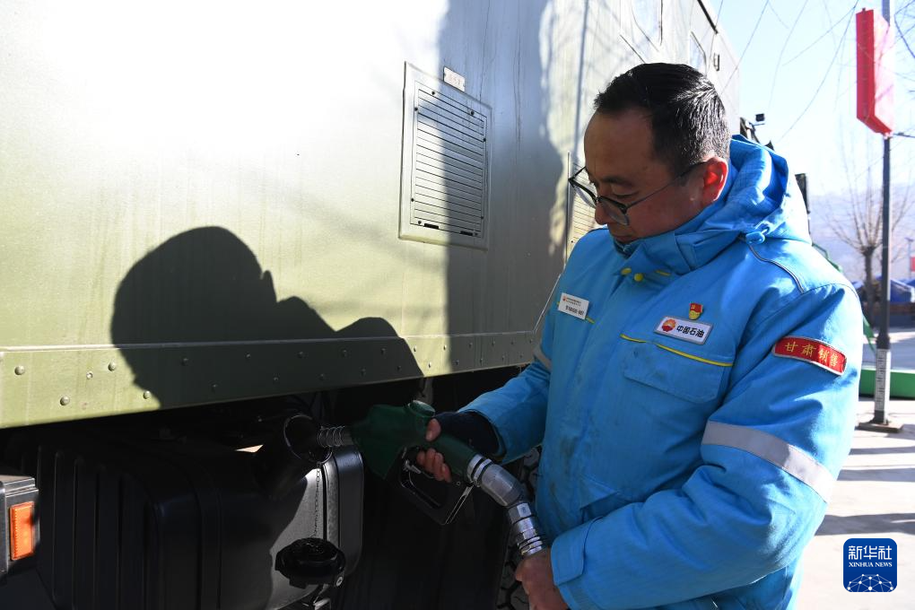 12月24日,在积石山县刘集乡高李村安置点,中国石油甘肃销售公司的员工用流动加油车为救灾车辆加油。