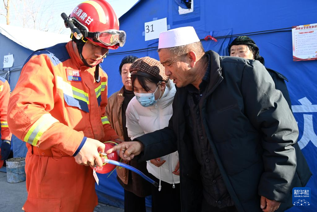 12月24日,在积石山县刘集乡高李村安置点,甘肃省消防救援总队定西市消防救援支队的消防员为村民讲解灭火器使用方法。