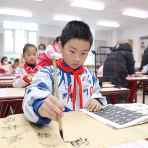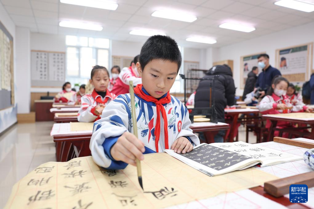 12月19日,在新疆生产建设兵团第二中学第十一师分校,学生昝贺(前)和同学一起练习毛笔书法。