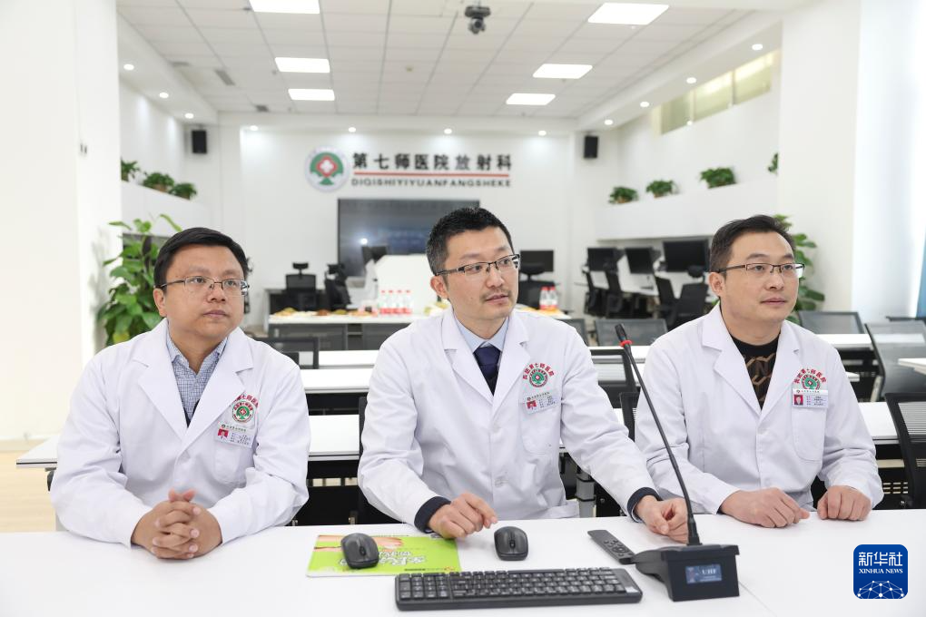 在新疆生产建设兵团第七师医院远程会诊中心,江苏援疆医生胡国栋(中)与同事一起通过视频帮助基层医院会诊(12月23日摄)。