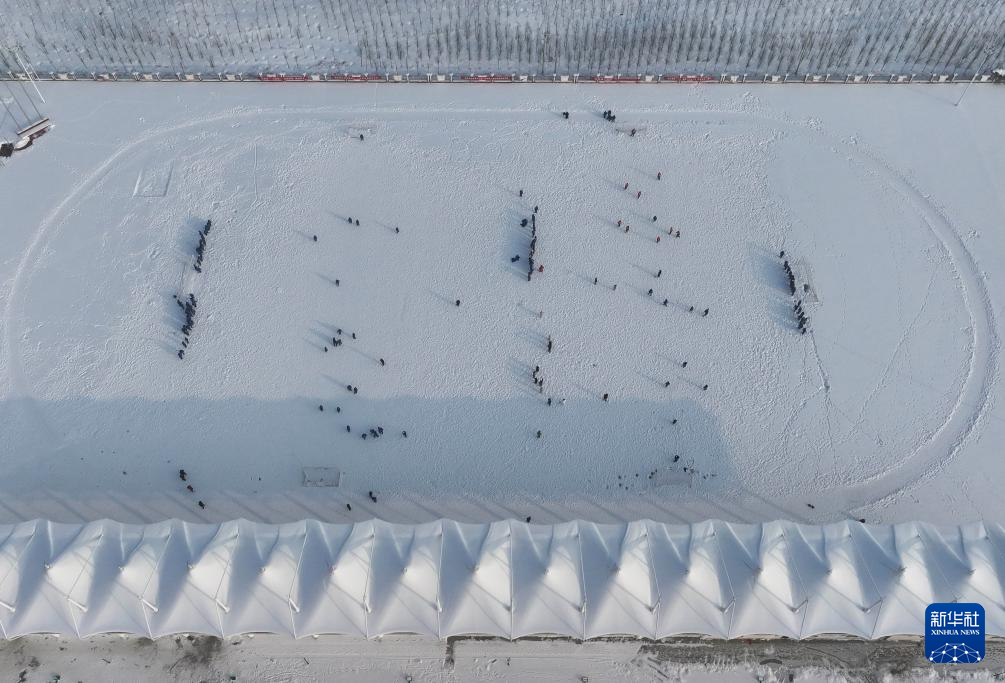 在新疆生产建设兵团第七师胡杨河市第一中学,学生在操场参加雪地足球赛(12月23日摄,无人机照片)。