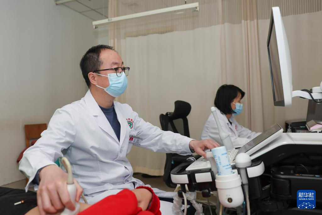 在新疆生产建设兵团第七师医院,来自江苏淮安市第二人民医院的援疆医生刘天友在给患者做检查(12月23日摄)。