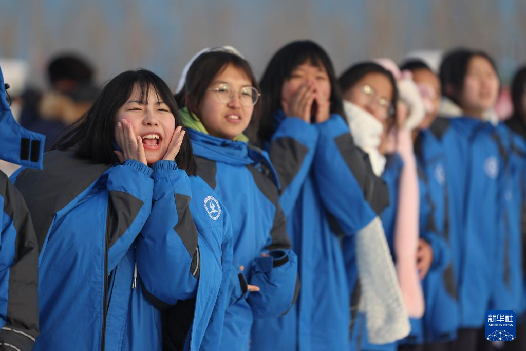 在新疆生产建设兵团第七师胡杨河市第一中学,学生在操场上观看雪地足球赛(12月23日摄)。
