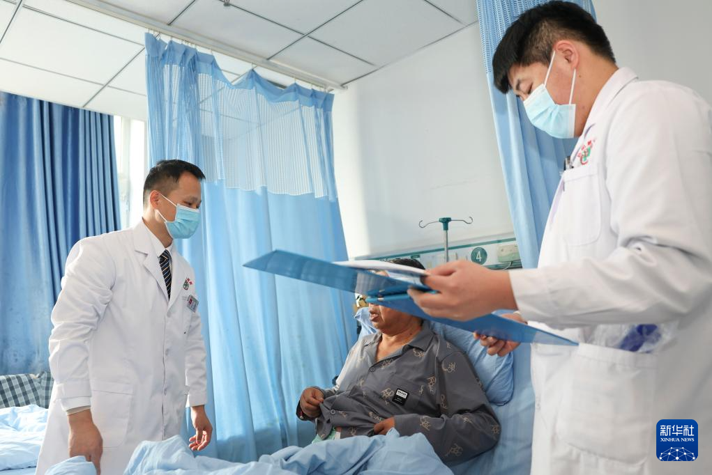 在新疆生产建设兵团第七师医院,江苏援疆医生徐峰(左)和当地医生赵强一起巡查病房(12月23日摄)。赵强是徐峰负责“传帮带”的青年医生之一。